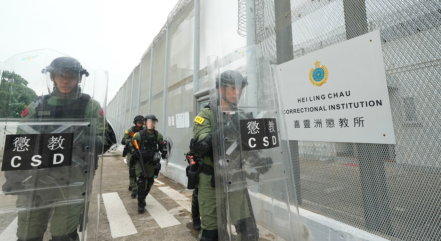 A total of more than 150 staff members from different government departments, including the Correctional Emergency Response Team and the Regional Response Team, the Hong Kong Police Force and the Government Flying Service, took part in the exercise.