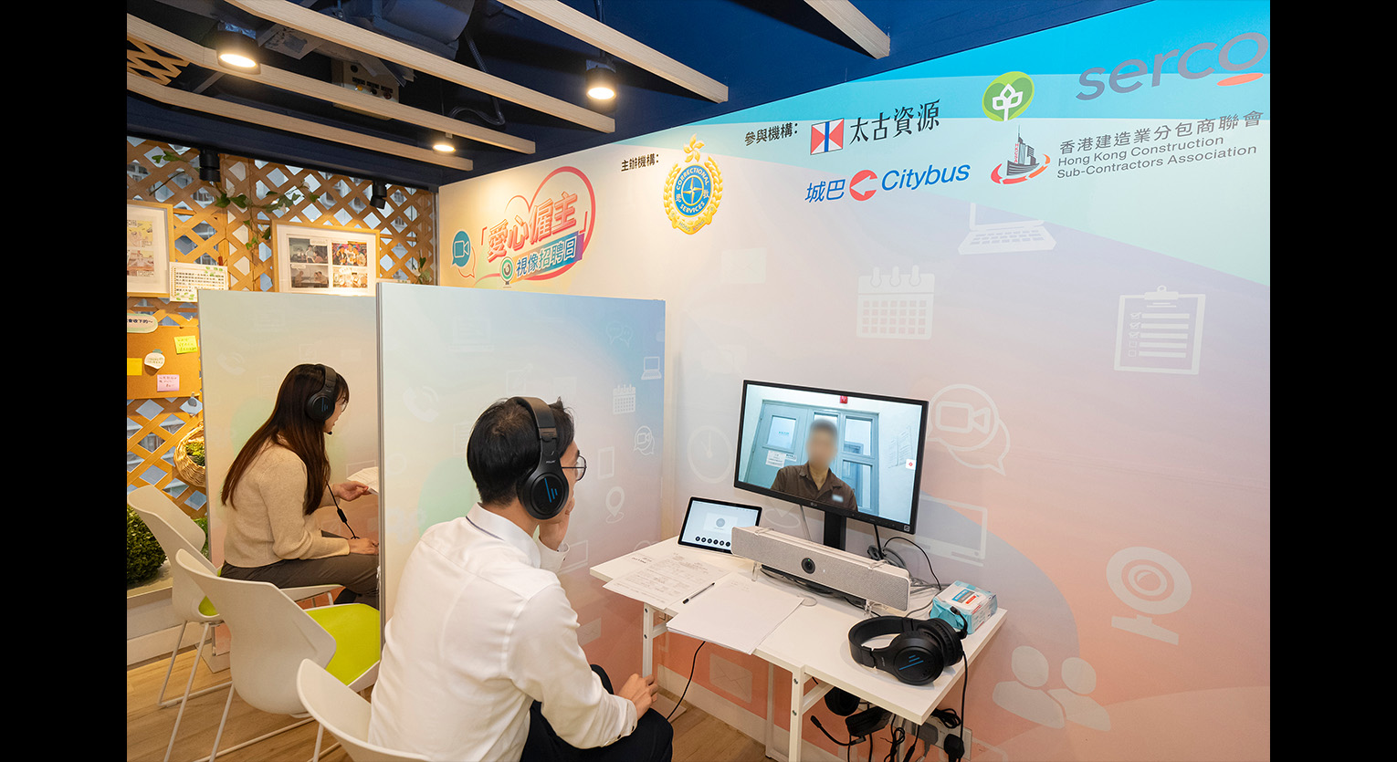 本署於上月10日舉辦「愛心僱主」視像招聘會,為即將於三個月內獲釋的在囚人士提供就業配對機會。活動共安排超過40名來自八間懲教院所的在囚人士參與,本署安排僱主在旺角、筲箕灣及沙田的多用途家庭及更生服務中心,透過視像會議形式進行面試。助理署長(更生事務)唐恂亦前往各多用途家庭及更生服務中心視察視像招聘會的情況。