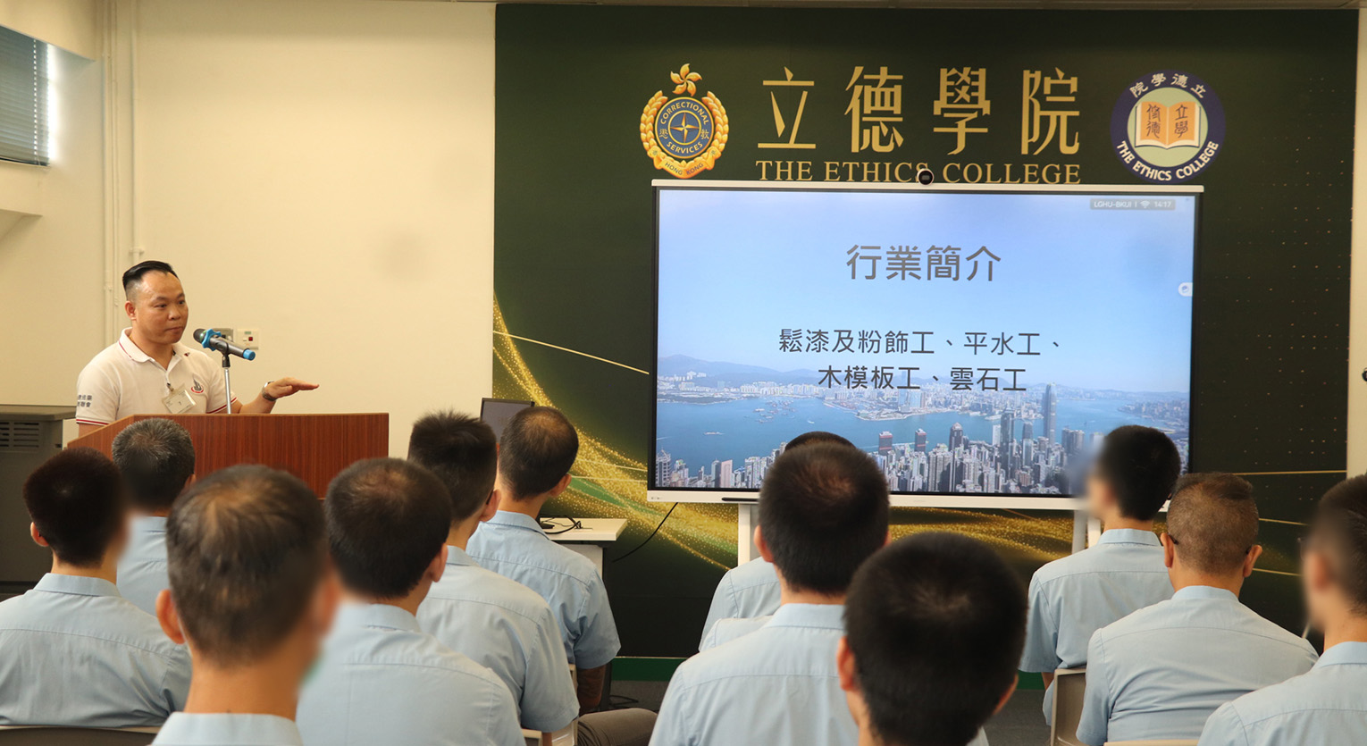 為協助在囚人士釋後就業作好準備,本署與香港建造業分包商聯會早前在壁屋監獄為24名立德學院學員舉辦建造業就業講座暨招聘會。是次活動旨在向學員介紹建造業「先聘請,後培訓」就業計劃,協助他們於獲釋後投入勞動市場,縮短適應期。講座內容詳細介紹了鬆漆及粉飾工、平水工、木模板工及雲石工四個特定建造業工種的實務操作與行業前景。