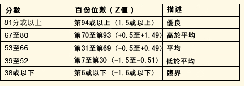 根據對香港一般民眾的社區研究(樣本大小(n) = 10,997, Ni et al 2015),受訪者在彈性量表測驗的平均分為60,標準差為14。參考此研究,韌力分數的分類如下: